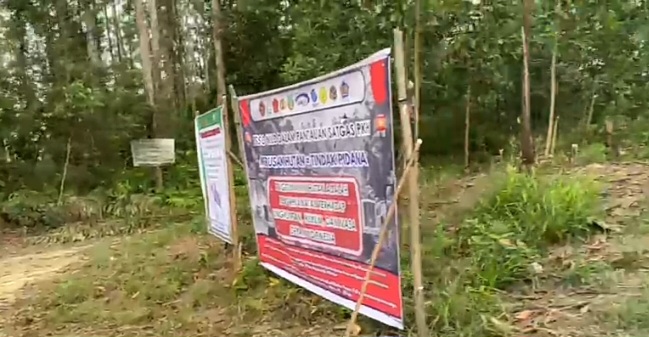 (Plang Satgas PKH, di Irisan Lahan Kensesi HTI PT RAPP atau April Group Estate Ukui, masuk di Kawasan TNTN)